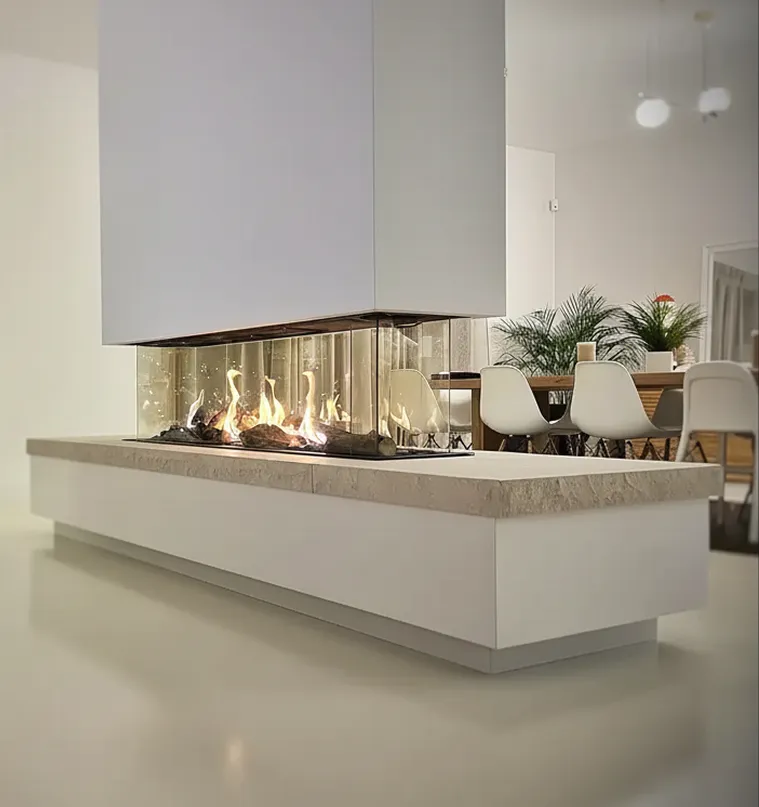 Un foyer gaz Élément 4/ Ruegg central avec 4 vitres pour séparer l’espace.