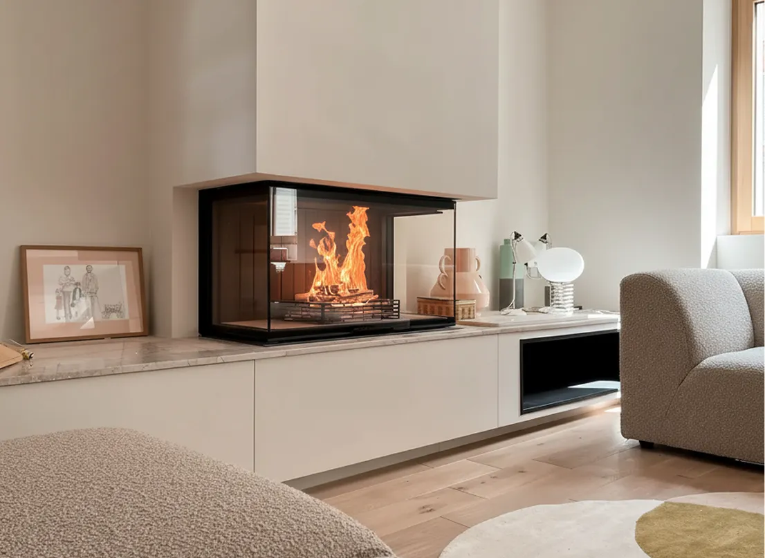 - Installation d’une cheminée d’angle : Conçue pour maximiser l’espace et offrir une vue imprenable sur le feu depuis plusieurs angles de la pièce.