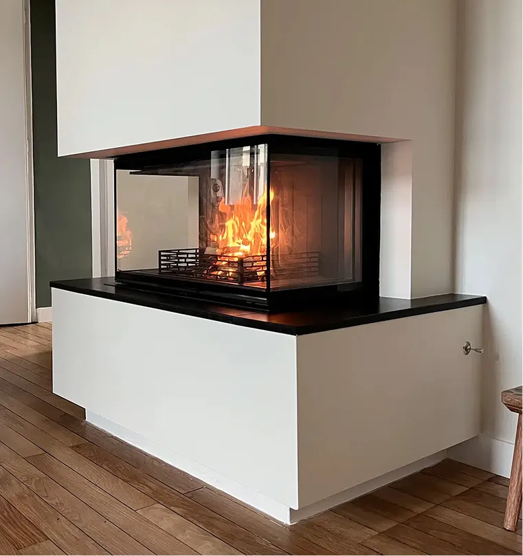 - Chaleur instantanée : Avec un simple geste, nos clients peuvent profiter de la chaleur enveloppante de leur cheminée gaz d’angle.